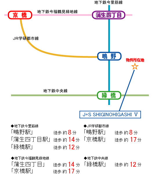 地下鉄今里筋線 『鴫野』駅 徒歩 約8分 JR 『鴫野』駅 徒歩 約8分 地下鉄今里筋線 『緑橋』駅 徒歩 約12分 地下鉄中央線 『緑橋』駅 徒歩 約12分 地下鉄今里筋線 『蒲生4丁目』駅 徒歩 約14分 JR大阪環状線 『京橋』駅 徒歩 約17分 |